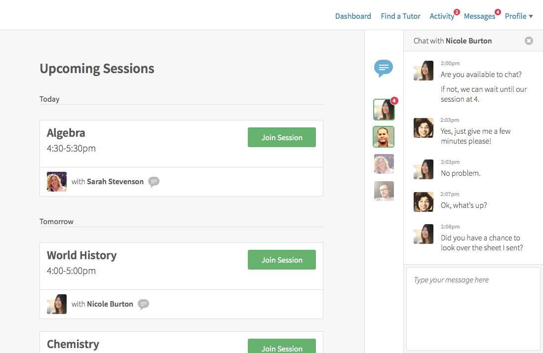 A web tutoring app including scheduling, text and video chat, and screensharing.